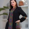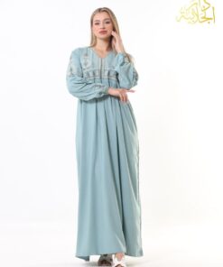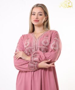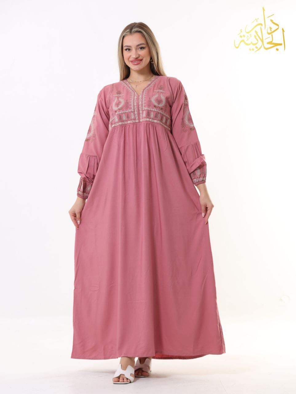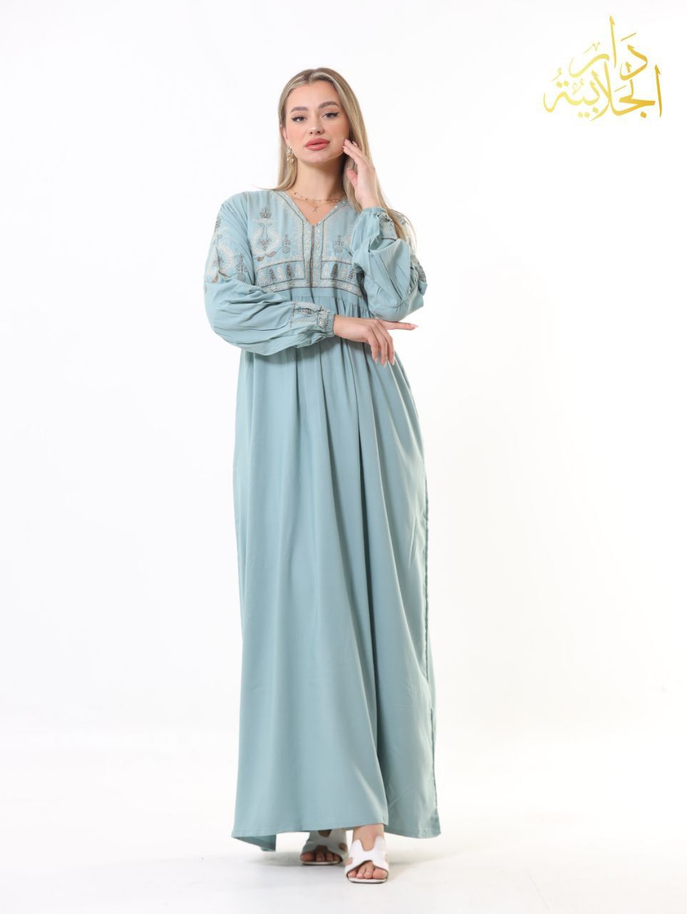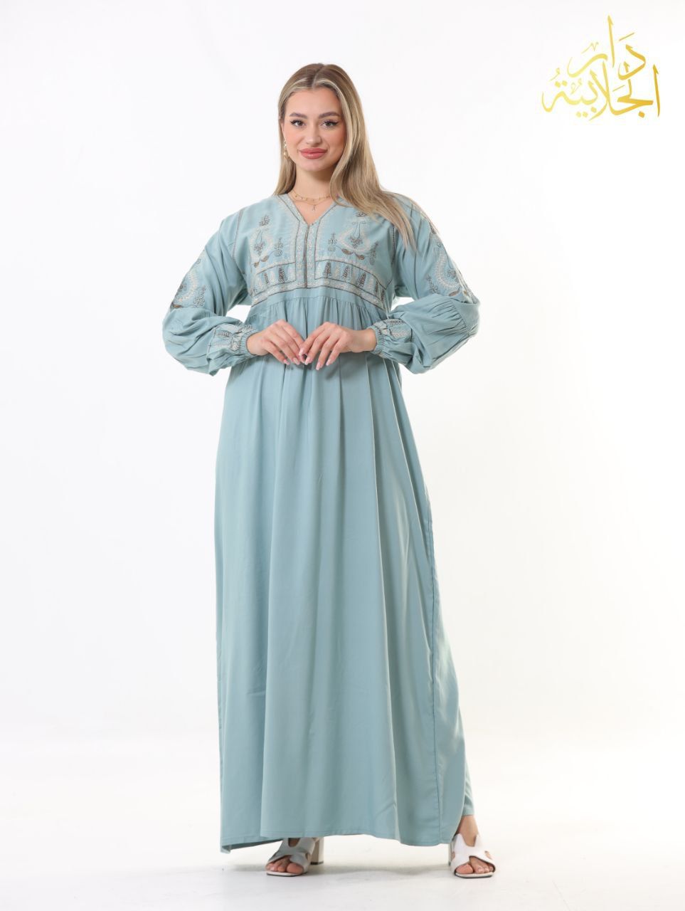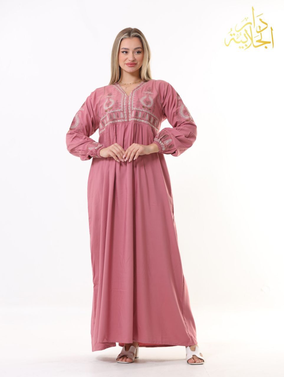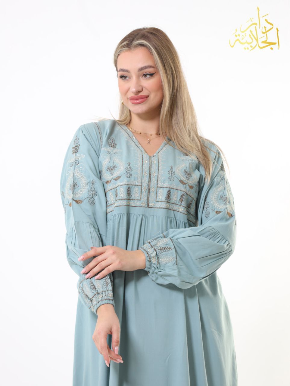 جلابية أنيقة بقصة صدر كسر، مزينة بتطريز فاخر على الصدر والأكمام لمظهر راقٍ ومميز.