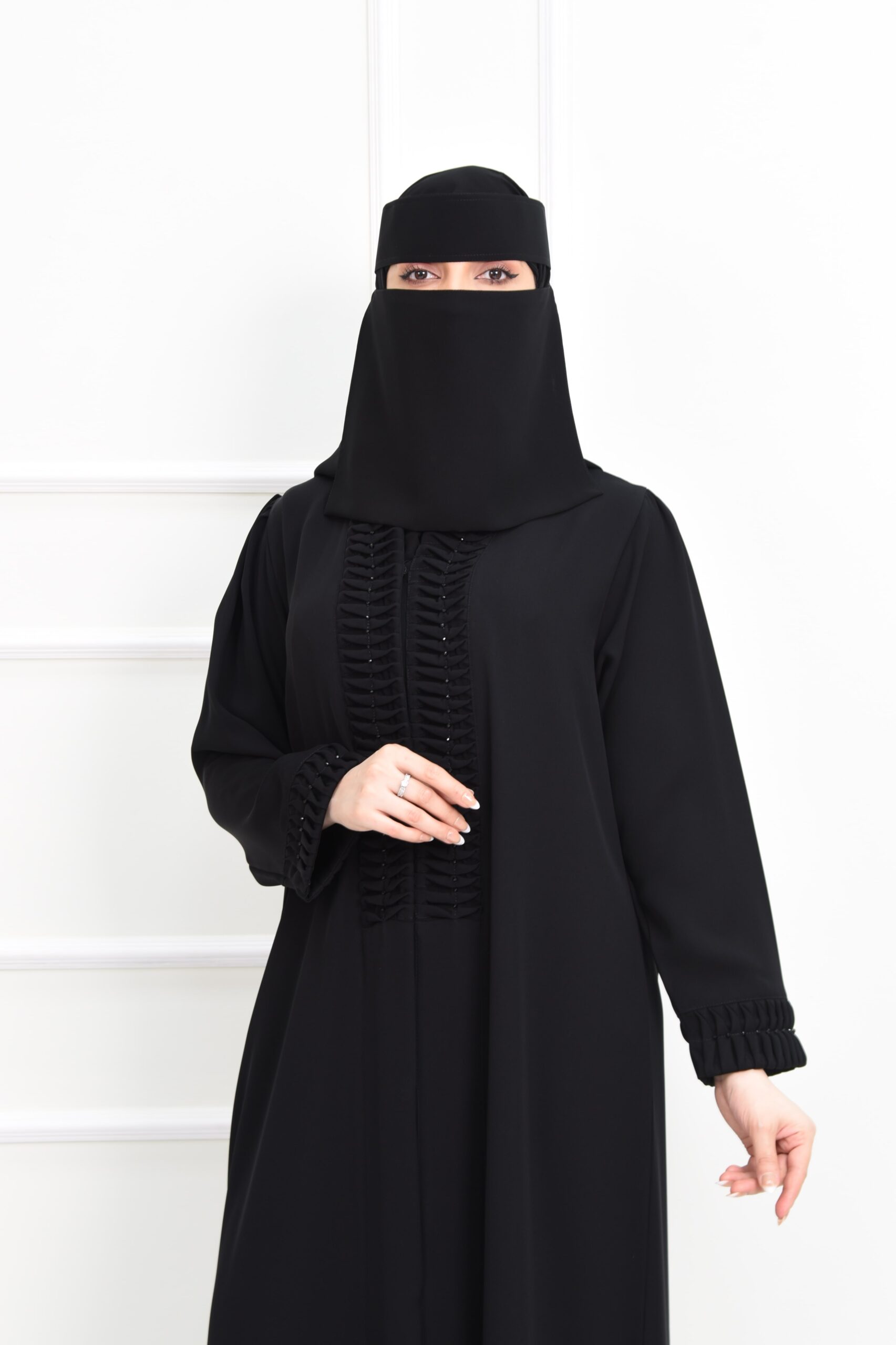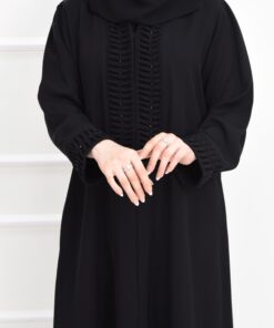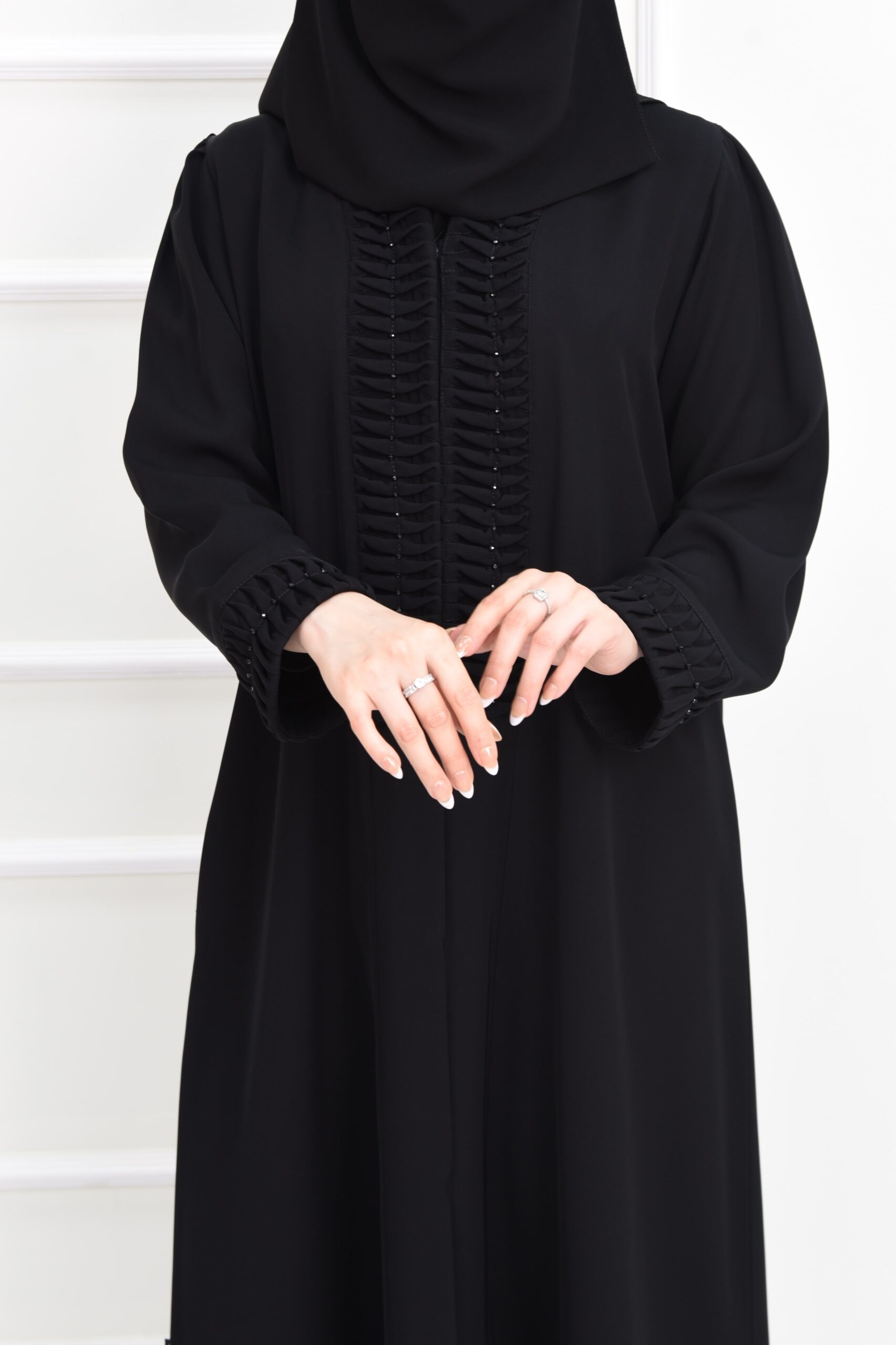 وصف العباية: عباية مناسبات راقية بتصميم مميزاً. تتميز بياقة كسرات حول الرقبة مرصعة بلمسات خرز أنيقة، مع تكرار تفاصيل الكسرات على الأكمام لتكمل جمالية التصميم. ق…